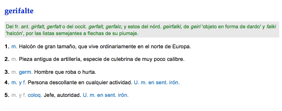 ¿Sabían ustedes que gerifalte es un halcón de unos 60 cm de longitud, plumaje pardo con rayas claras en las alas y la cola, y blanquecino con listas cenicientas en el vientre? ¿No? Yo tampoco.